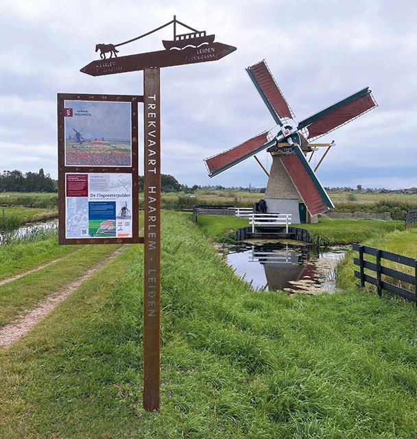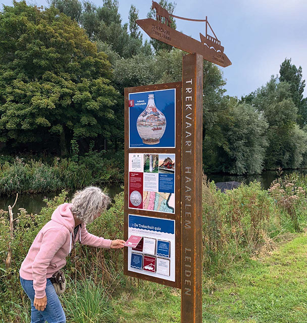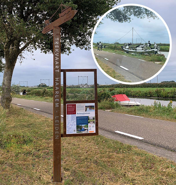 Op verschillende locatie langs de trekvaart tussen Haarlem en Leiden wordt informatie gegeven over dit historische tracé. De eyecatcher vormt de wegwijzer met schuit en paard bovenop.