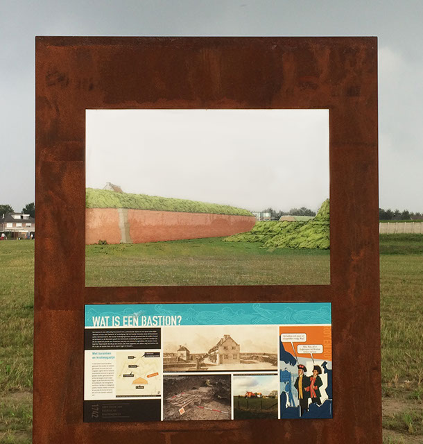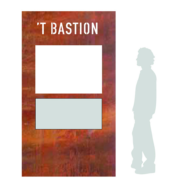 Frame: 8 mm dik Cortenstaal, met uitgesneden tekst. Het informatiepaneel wordt gemonteerd in een verzonken kamer dit bemoeilijkt demontage door vandalisme.