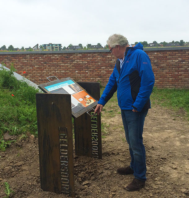 Frame: 3 mm dik gezet Cortenstaal, met uitgesneden tekst. Het paneel wordt gemonteerd in een verzonken kamer dit bemoeilijkt demontage door vandalisme.