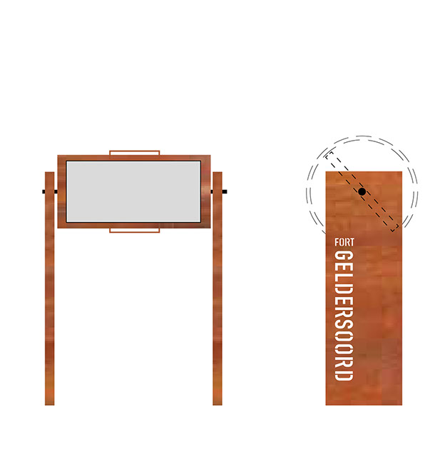 Dit is een interactief informatieframe. De handvatten nodigen de recreant uit om de framelijst te draaien. Zo zijn twee kanten van het verhaal te zien. Natuur-cultuur, heden-verleden, overzicht en detail etc. Het rotatieframe is een kleine attractie! De roterende framelijst maakt het mogelijk relatief veel te communiceren binnen een bescheiden volume.