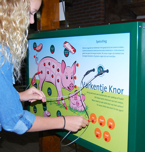 Wie kent nog het oude electrospel? Daarbij moet je juiste combinaties maken door twee onderdelen met pinnen te verbinden. Dit concept heeft ons geïnspireerd voor de ontwikkeling van het Kloeg Elektropaneel. Een juiste combinatie levert een groene lamp en een leuk geluid op. Dit motiveert natuurlijk om meer goede combinaties te vinden.