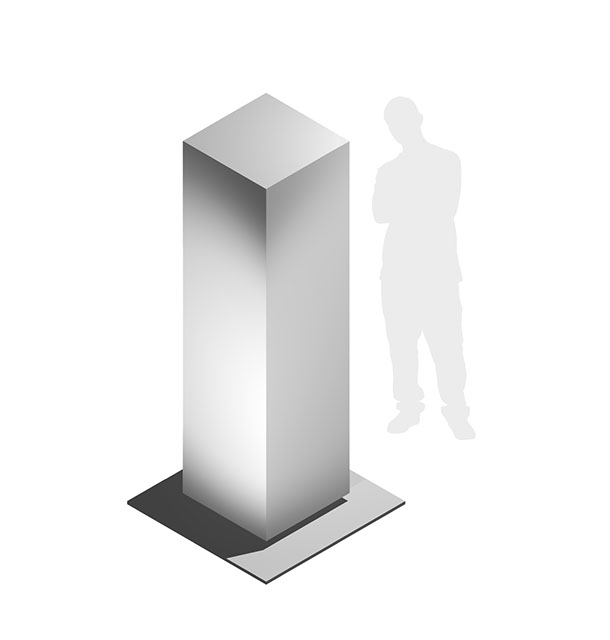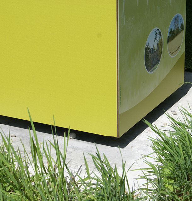 Een uniek en robuust ontwerp laat deze zuil in de ruimte zweven. Niet alleen esthetisch fraai, maar ook praktisch omdat spatwater de onderkant niet vervuilt. De panelen worden opgemaakt in de huisstijl van de opdrachtgever.
