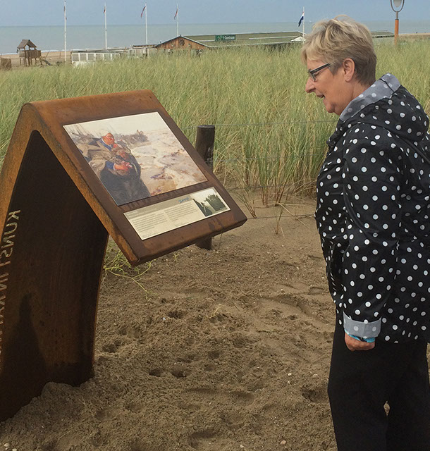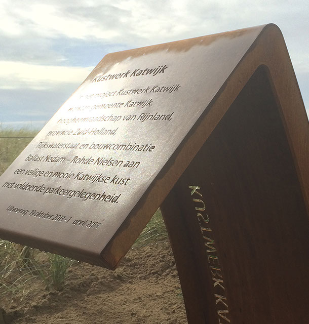 Dit frame is het resultaat van een typisch staaltje maatwerk. De frames sluiten qua materiaal en vorm aan op de her ingerichte zeereep van Katwijk alwaar deze frames voorbijgangers informeren over historische kunstwerken.