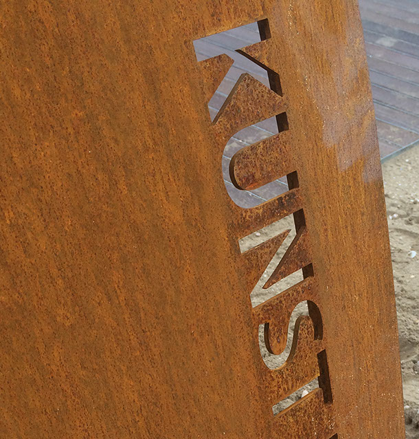 Frame: Cortenstaal, gezet met uitgesneden tekst. Het paneel wordt gemonteerd in een verzonken kamer dit bemoeilijkt demontage door vandalisme.