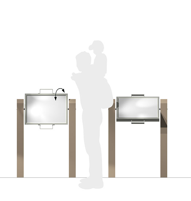 Kloeg rotatieframe; is een interactief paneel. De recreant kan het paneel omdraaien en ziet zo twee kanten van het verhaal. heden en verleden - natuur en cultuur - overzicht en detail. Het rotatieframe is een kleine attractie.